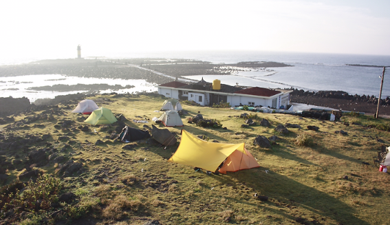 나는 비양봉 아래쪽, 잔디가 펼쳐진 너른 초원지대에 텐트를 쳤다.