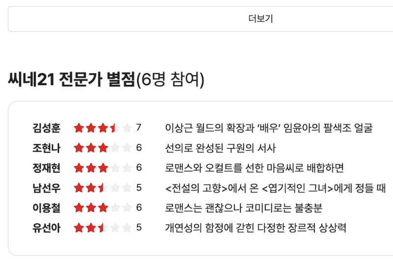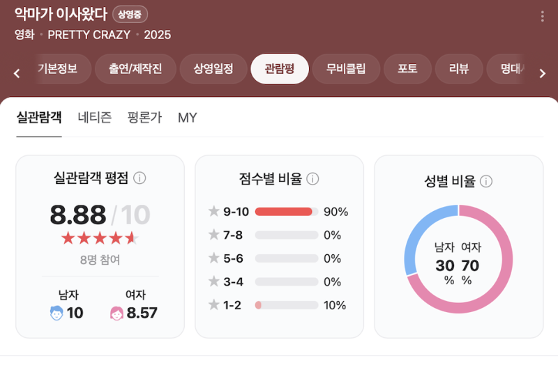 코미디·로맨스·미스터리·오컬트까지 욕심을 낸 탓에, 장르적 톤이 조금 산만하게 느껴집니다. 웃다가도 갑자기 진지해지고, 다시 코미디로 전환되는 흐름이 몰입을 방해하기도 합니다. - 전작과의 비교감독의 전작 《엑시트》처럼 탄탄한 긴장감과 완성도를 기대한 관객에겐 다소 평범하게 느껴질 수 있습니다.